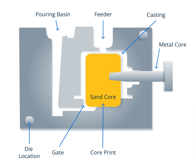- Einfache und klare FließwegeFormen Sie die Form so, dass geschmolzene Metalle reibungslos ohne Turbulenzen fließen können. Dies reduziert Lufttaschen und stellt sicher, dass jedes Detail korrekt ausgefüllt wird.