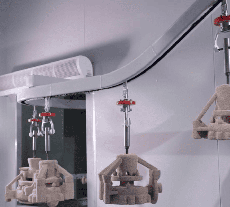 The formed shells are then fully cured in an oven, strengthening them to tensile strengths around 350 to 450 psi. After curing, the shells are carefully removed from the patterns.